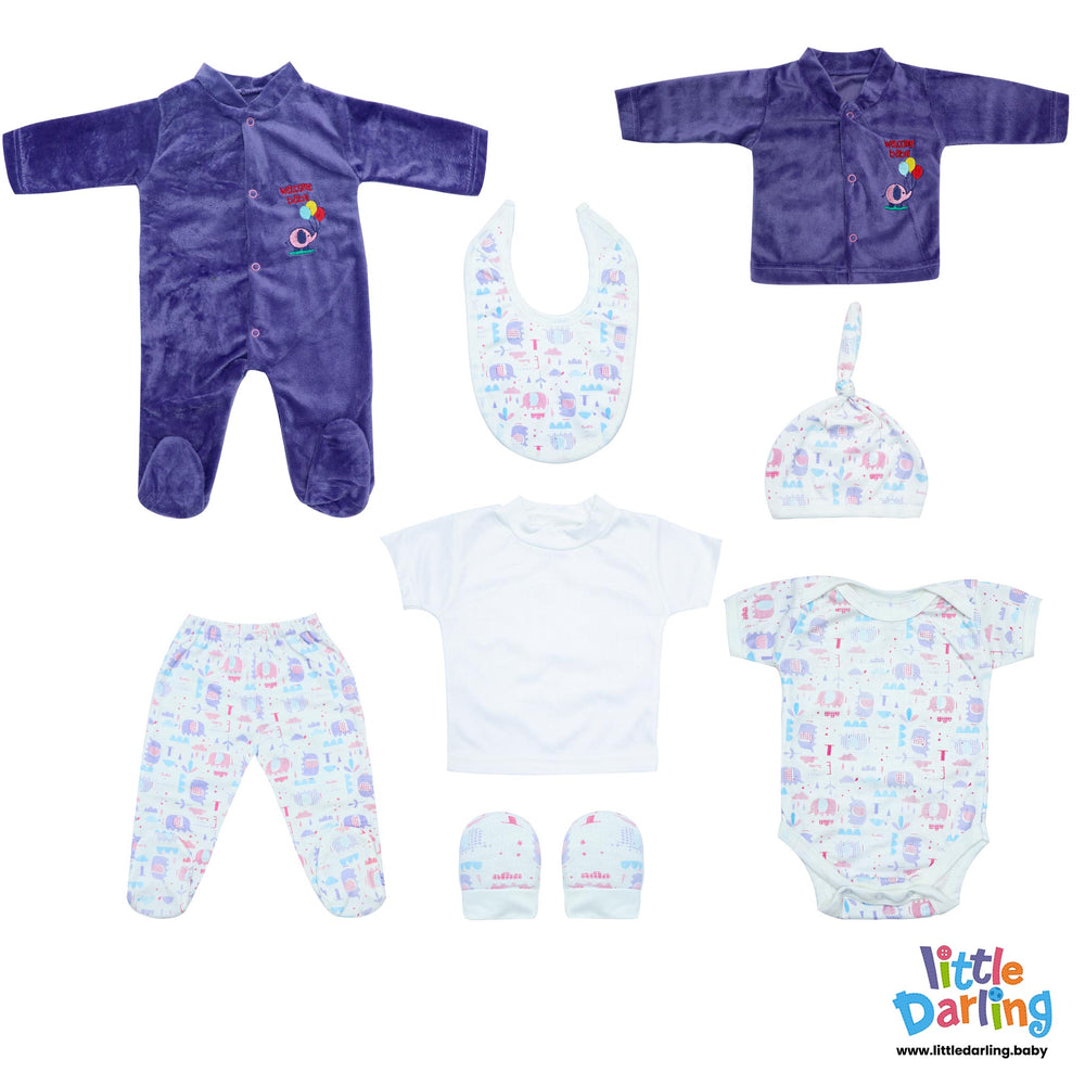 Indulge in sheer adorableness with our 8-piece gift set, designed to make your newborn's early days even more charming. The delightful elephant and turtle theme in lovely purple hues adds an extra touch of sweetness to this collection.
