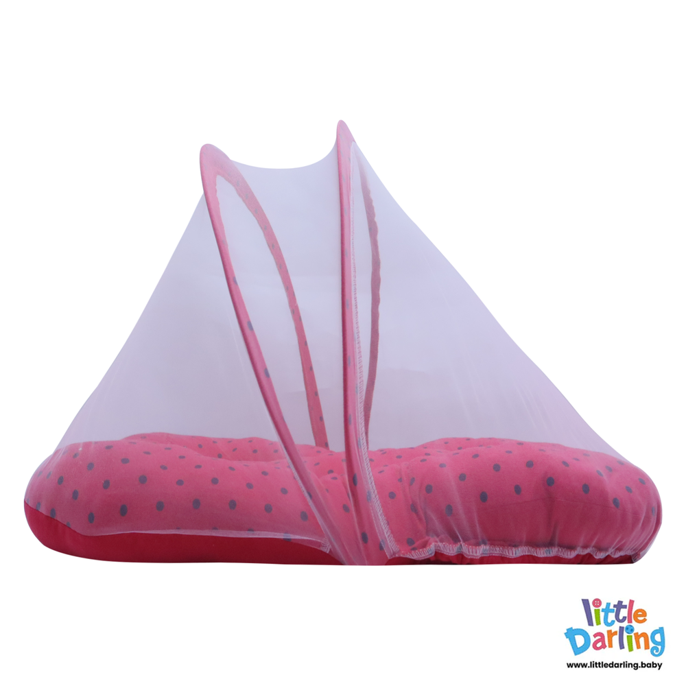 Comfortable & Supportive: Soft padded mattress provides gentle support for newborns and infants. Full Mosquito Protection: Attached net keeps mosquitoes, flies, and insects away for safe, uninterrupted sleep. Breathable & Safe Fabric: Made from skin-friendly, breathable materials ideal for babies’ delicate skin. Portable & Travel-Friendly: Lightweight design makes it easy to carry anywhere—perfect for home, outings, and vacations. Adorable Design: Cute blue polka dot print adds a pleasant, playful look. Easy Maintenance: Fabric and net are simple to clean and dries quickly. All-in-One Sleeping Solution: Combines mattress + pillow support + mosquito net in one convenient product.