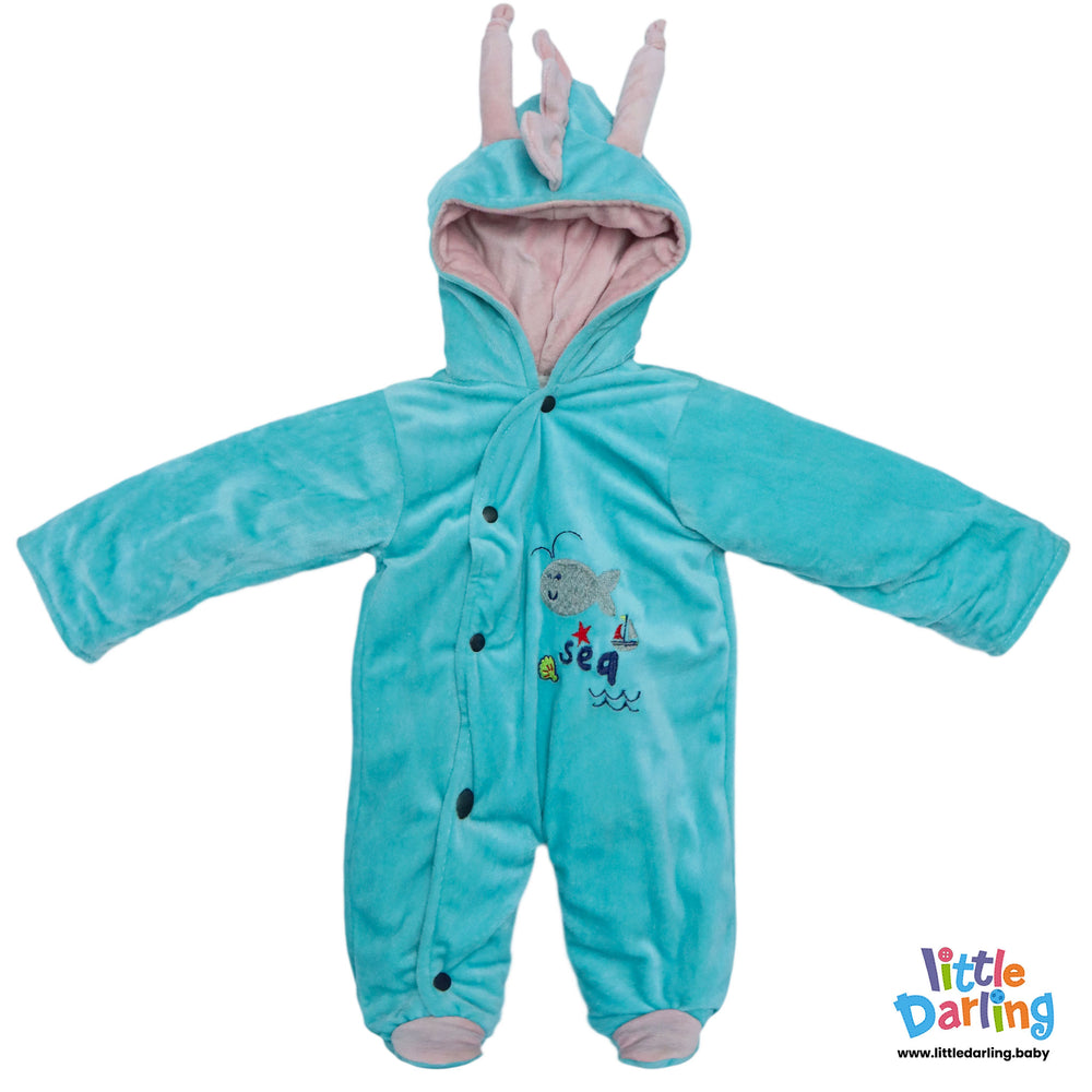 Buy Hooded Velour Romper Fish Embroidery Sky Blue Color by Little Darling in Pakistan